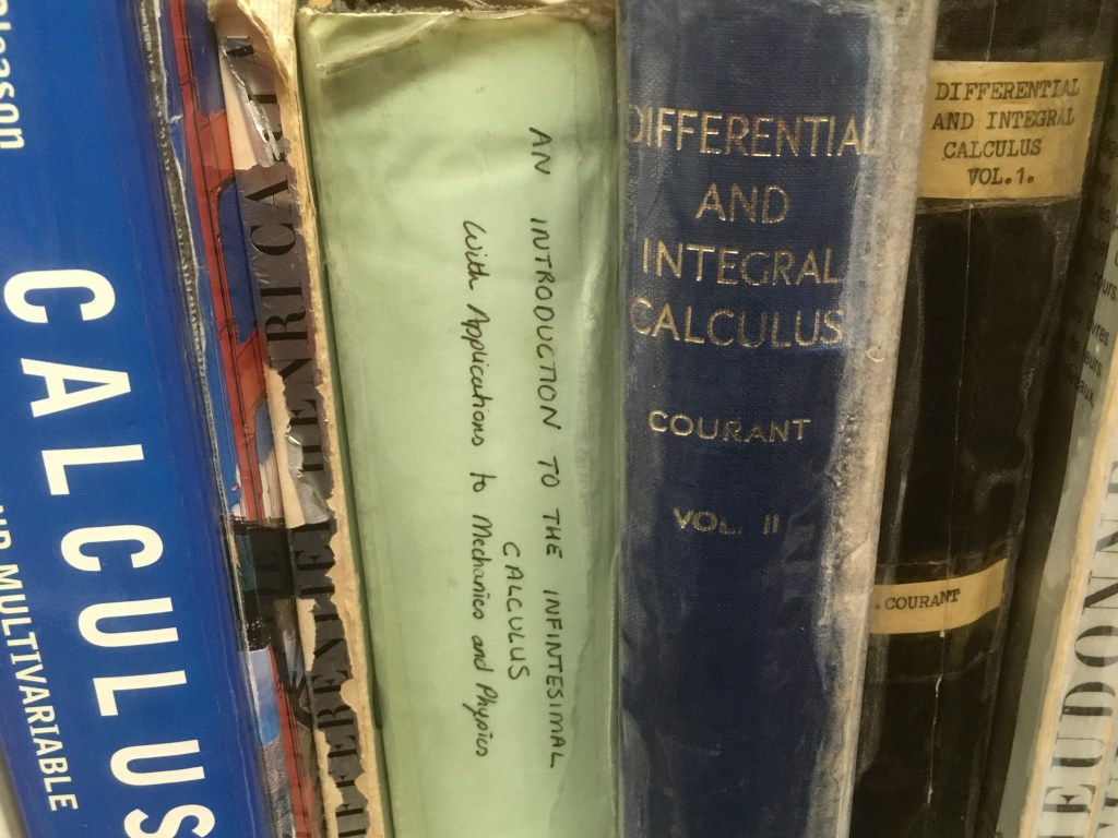 Now in the Reading Room, we wove in and out of the shelves, scanning. sometimes in shadow as we waited for the light sensors to engage.   We were in data science, before the confluence with classical mathematics.  The data science spines were uniformly silver and the class marks fiendishly complex.  Before the bulbs in the stack were triggered, the space appeared like a shimmering tunnel leading to the light of the reading room.  When data eventually met mathematics, this uniformity changed, each volume now possessing a distinct personality.  This was partly the work of the Collection Care team tenderly effecting their repairs.  We were getting closer.  It’s there, the mathematician said.   He plucked the book from between two weightier ones and a smile released his face.